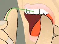 Use your thumbs and forefingers to guide about one inch of floss between your teeth.